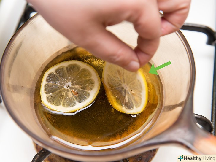 Використовуйте гліцерин замість меду.якщо у вас немає меду або ви з якихось причин не можете його використовувати, замініть його гліцерином. Розігрійте суміш, що складається з ½ склянки гліцерину і ½ склянки води на повільному вогні. Потім додайте 3-4 столові ложки лимонного соку в отриману суміш. Після цього додайте ¼ - ⅓ склянки води. Помішуйте, продовжуючи нагрівати суміш на повільному вогні. Охолодіть суміш. Коли вам знадобиться ліки від кашлю, приймайте цей засіб по 1-2 столові ложки.- Гліцерин визнаний безпечним засобом для прийому всередину. Чистий гліцерин-безбарвна в'язка солодкувата рідина без запаху, яка використовується для виготовлення харчових продуктів і засобів особистої гігієни.[8]