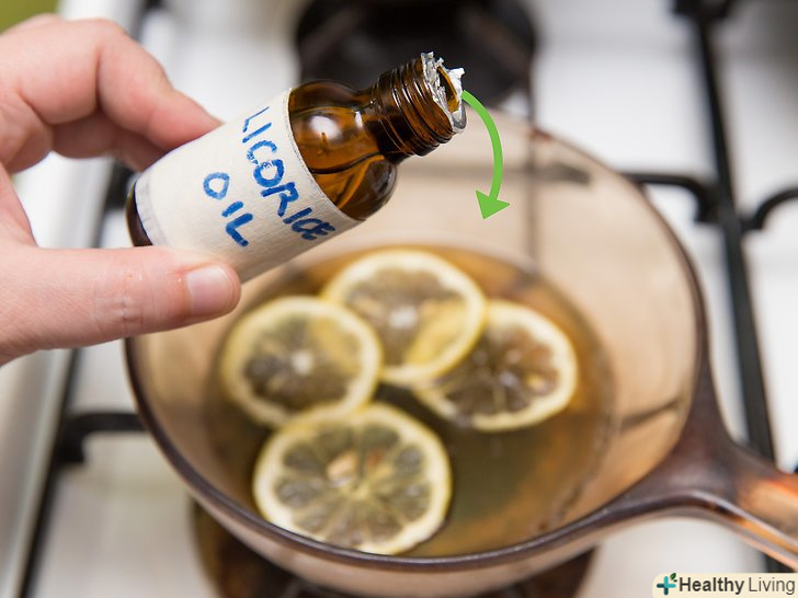 Приготуйте ліки від кашлю на основі солодки і суміші з меду і лимона.Солодка має відхаркувальну властивість. Вона помірно стимулює виробництво мокротиння, що полегшує її виведення з легких.[7]- Додайте 3-5 крапель ефірного масла солодки або 1 чайну ложку висушеного кореня солодки в медово-лимонну суміш перед додаванням води. Нагрівайте на повільному вогні протягом 10 хвилин, а потім додайте ¼ - ⅓ склянки води в отриману суміш. Продовжуйте нагрівати на повільному вогні, постійно помішуючи.