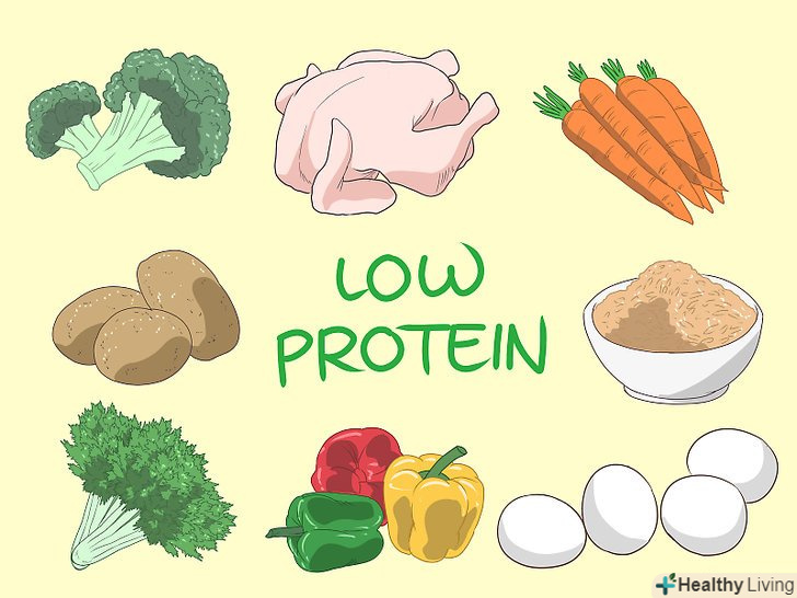 Сядьте на дієту з низьким вмістом білка, якщо це необхідно.у разі важкого ураження нирок хворому може знадобитися дієта з низьким вмістом білка, щоб запобігти скупченню в крові надмірної кількості токсинів. З білків утворюються "забруднюючі" речовини, для виведення яких ниркам доводиться більше працювати.[11]- Дізнайтеся у лікаря, чи слід вам почати дієту з низьким вмістом білка. В цьому випадку лікар направить вас до дієтолога, який розповість, що вам можна їсти.