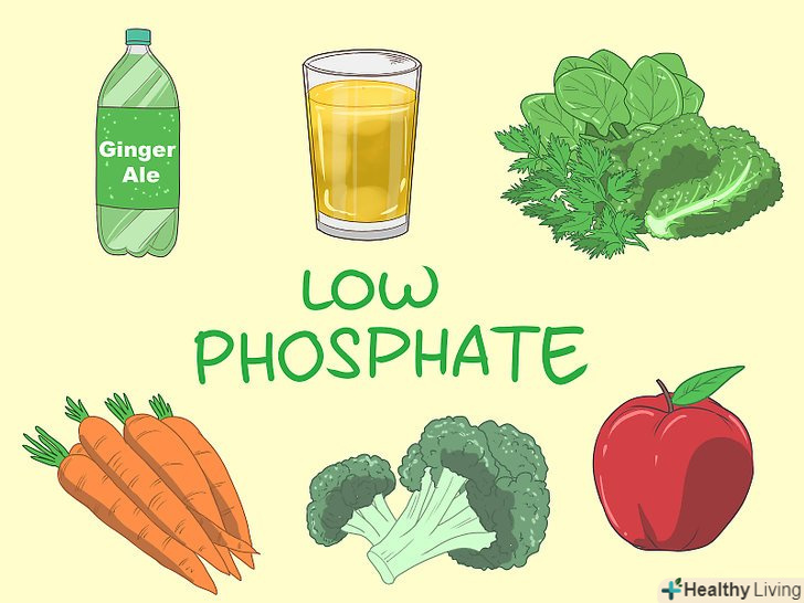 Дізнайтеся, чи слід почати дієту з низьким вмістом фосфатів.якщо у вас виявиться високий рівень фосфатів, лікар може порадити вам сісти на дієту з низьким вмістом фосфатів. У молочних продуктах міститься багато фосфатів, так що обмежте споживання молочних продуктів, а також яєць, червоного м'яса і риби.[12]- Якщо зниження споживання фосфатів не дало належного результату, лікар може призначити вам фосфатно-зв'язуючий препарат. Ці препарати необхідно приймати під час їжі, щоб поглинути фосфати, які містяться в їжі.[13]