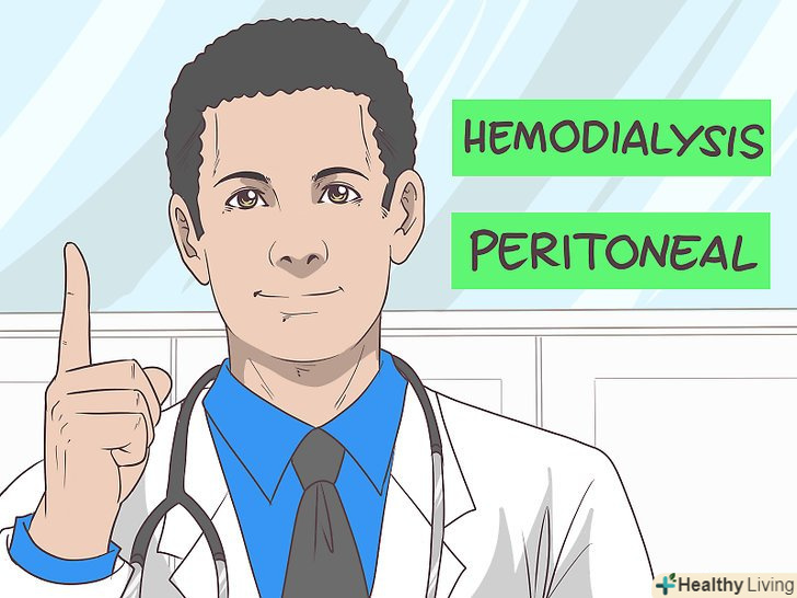 Подумайте про те, щоб почати проходити діаліз.якщо нирки будуть працювати недостатньо добре і не зможуть виводити токсини і рідини з організму, вам може знадобитися діаліз. Це може бути гемодіаліз або перинеальний діаліз.[15]- гемодіаліз проводиться за допомогою апарату, який виводить з організму токсини і зайву рідину. Для проходження цього виду діалізу хворому доведеться ходити в лікарню кілька днів на тиждень.
