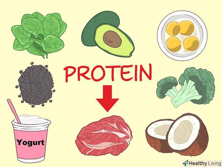 Їжте помірну кількість білка. приблизно 20-30% всіх калорій повинні бути отримані з білка. Занадто велика кількість білка може нашкодити ниркам, але він все ще необхідний для базових процесів організму.- Відмовтеся від протеїнової дієти, якщо у вас вже порушена робота нирок. Харчування з високим вмістом білка може нашкодити ниркам.[3]