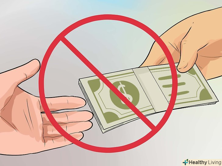 Не допускайте звичайної поведінки. щоб вибратися з порочного кола залежності людина повинна розуміти, що може на вас розраховувати, що буде незамінною допомогою на шляху до одужання. Навчіться говорити " Ні " і будьте віддані цій лінії; напевно це найскладніше в позбавленні від залежності. Важливо відзначити, що наркоман, можливо, не буде реагувати на ваші відмови в чому-небудь, поки ви будете давати йому те, що він хоче. [25]- Якщо залежна людина є членом вашої родини або другом, думайте також і про гроші. Вирішіть, чи готові ви давати йому гроші чи ні. Багато людей проти того, щоб давати залежним людям гроші, так як все одно вони витратять їх на наркотики, проте в іншому випадку він може піти на злочини для того, щоб добути їх. Прийміть рішення і дотримуйтесь його. Якщо ви не хочете давати гроші, поясніть причину, чому ви так робите. Якщо ви все ж вирішили фінансувати його, скажіть, щоб він записував всі свої витрати, і попередьте, що зажадаєте їх в кінці назад. Якщо він не буде так робити, припиніть давати йому гроші. [26] [27]