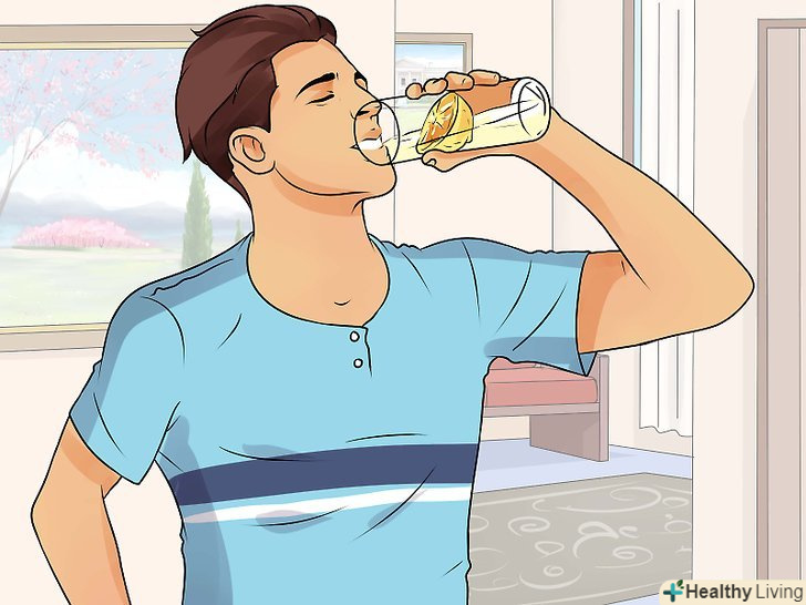 Пийте багато рідини. Будучи на роботі, пийте багато води протягом дня, щоб зберігати бадьорість і пильність (в розумних межах). Також корисні і спортивні напої, такі як Powerade або Gatorade. У них містяться електроліти, які допоможуть впоратися зі зневодненням. Алкоголь позбавляє організм рідини, тому вам буде потрібно її заповнити. [4]- Спочатку повільно пийте воду невеликими ковтками. Якщо ви відчуваєте, що вас ось-ось знудить, все, що ви вживете, спровокує блювоту. Поступово ви, швидше за все, зможете пити більше і швидше.