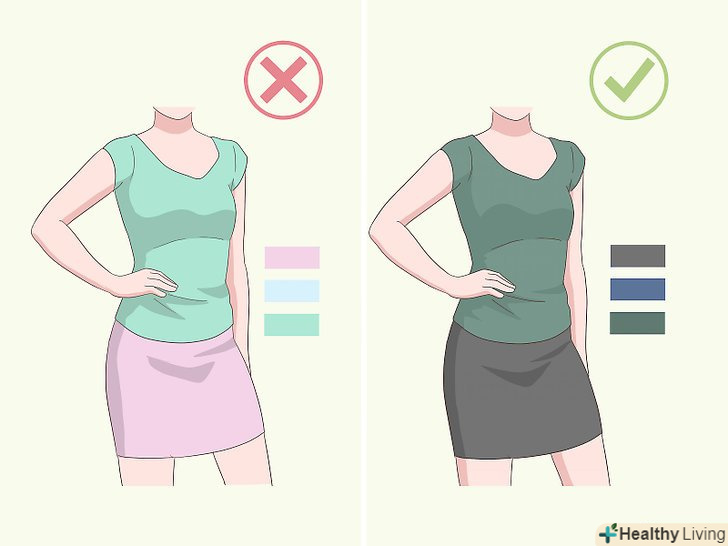Носіть одяг темних кольорів. часом, щоб здаватися вище, необхідно здаватися худіше. Такі кольори, як чорний, темно-синій і яскраво-зелений, дозволяють здаватися худіше і вище, особливо якщо надягати темний верх і низ.
