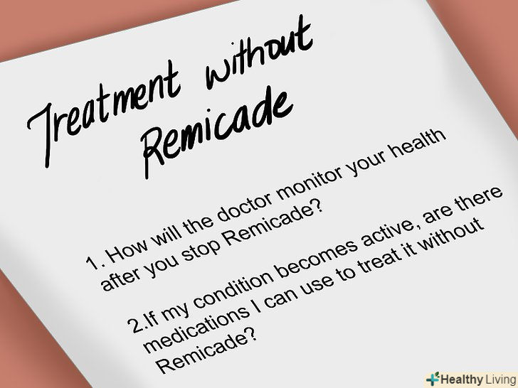 Складіть план лікування без Ремікейду. якщо у вас серйозне захворювання, то обов'язково дізнайтеся у лікаря, що він планує робити в разі погіршення стану. При припиненні прийому Ремікейду, як правило, не виникає синдрому відміни. Незважаючи на це дуже важливо спостерігатися у лікаря регулярно, щоб ваш стан не погіршився. При скасуванні Ремікейду ви можете задати лікарю наступні питання:- На які симптоми слід звертати увагу, щоб переконатися в тому, що захворювання не повертається?
