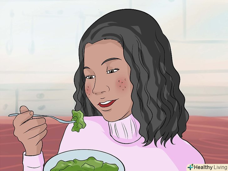 Їжте здорову їжу. дотримуйтеся дієти, багатої білками м'яса, цільним зерном, фруктами і овочами і жирними кислотами омега-3. Пийте багато води замість солодких, кофеїно-містять напоїв. Не вживайте занадто багато молочних продуктів, так як вони містять гормони, що викликають появу вугрів. [1]