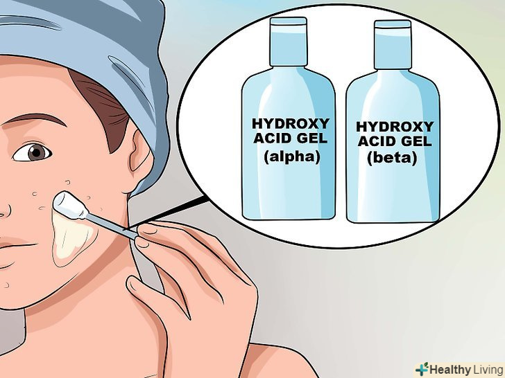 Використовуйте альфа-і бета-гідроксильні кислоти (або АНА і BHA). АНА і BHA є хімічними скрабами. Вони послаблюють зв'язуючі властивості ліпідів, які утримують мертві клітини шкіри навіть після того, як вони повинні були відлущитися. [4] BHA краще проникають в пори, тому що вони можуть проникнути прямо через масло або шкірне сало.- Застосовуйте хімічний пілінг АНА і BHA через чотири-шість тижнів. Частіше не означає Краще.