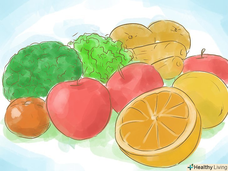 Їжте фрукти та овочі щодня. вживання достатньої кількості фруктів і овочів – це головний крок до здорового харчування і способу життя, оскільки ці продукти є основними джерелами вітамінів, мінералів і антиоксидантів. Проте, з'їдати рекомендовані сім-дев'ять порцій фруктів і овочів кожен день буває не так-то просто. [9]- Якщо ви не любитель фруктів і овочів, складіть список з п'яти улюблених продуктів цієї групи. Почніть з однієї порції фруктів або овочів на день. Як тільки ви пристосуєтеся до цієї мети – додайте ще одну порцію в день.