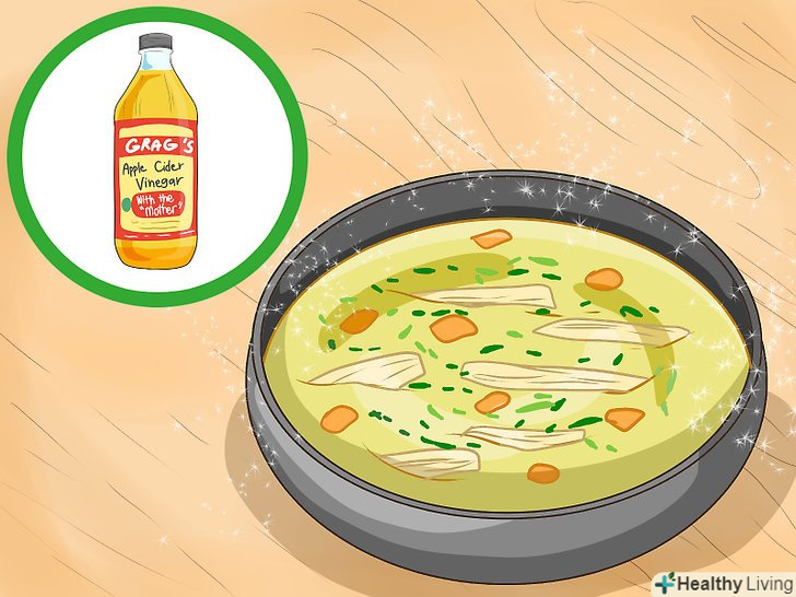 Додайте яблучний оцет в супи або тушковані страви. супи і тушковані страви наповнені різноманітними смаками, які приховають кислотність яблучного оцту. Додайте 1 столову ложку (15 мл) в тарілку супу і ретельно перемішайте. З'їжте суп до кінця, щоб в тарілці не залишилося яблучного оцту. [13]- Яблучний оцет можна додавати і в покупної, і в домашній суп.