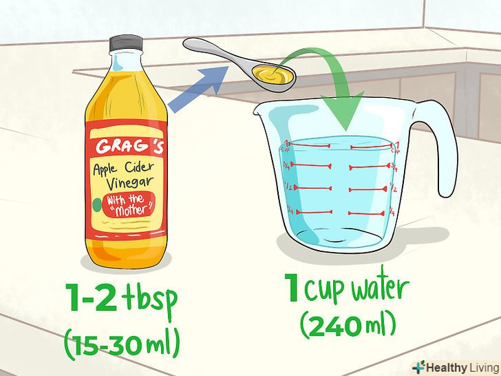 Розбавте яблучний оцет в 1 склянці (240 мл) води. сам по собі цей продукт надзвичайно кислотний і може завдати шкоди зубам і горлу, якщо приймати його в чистому вигляді. Струсіть пляшечку яблучного оцту, а потім відміряйте 1-2 столові ложки (15-30 мл) і розмішайте в склянці з водою. [3]- Можна використовувати як гарячу, так і холодну воду.