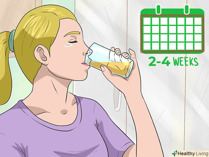 Продовжуйте приймати яблучний оцет протягом 2-4 тижнів. щоб і далі отримувати користь для здоров'я, приймайте яблучний оцет 2-3 рази щодня. Складіть розклад, рівномірно розподіливши прийоми кошти в перебігу дня, і пийте на порожній шлунок. Дотримуйтеся такого режиму аж до місяця, а потім скоротіть споживання до 1-2 столових ложок (15-30 мл) щоранку. [6]- Можна продовжувати приймати яблучний оцет кожен день або повторювати детокс-процедуру 3-4 разів на рік.