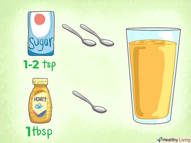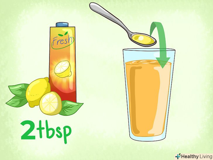 Додайте 2 столові ложки (30 мл) лимонного соку, щоб зробити напій більш терпким. можна або вичавити сік з 2 лимонів, або використовувати готовий лимонний сік з магазину. Регулюйте кількість лимонного соку в напої в залежності від того, наскільки кислим ви хочете його зробити. [10]- Розігрійте напій і додайте 1 столову ложку (20 грам) меду, щоб полегшити біль в горлі.