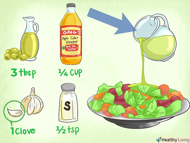 Змішайте яблучний оцет з заправкою для салату. змішайте в мисці 3 столові ложки (45 мл) оливкової олії, ¼ склянки (60 мл) яблучного оцту, 1 зубчик подрібненого часнику і ½ чайної ложки (3 грами) солі. Ретельно перемішайте. Вилийте третину заправки в салат, а решта приберіть в холодильник. [11]- Також можна змішати 1 столову ложку (15 мл) яблучного оцту з вашим улюбленим соусом з магазину.