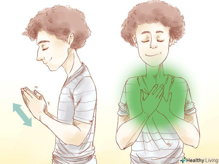 Спробуйте медитацію, спрямовану на серцеву чакру. серцева чакра — це одна з семи чакр, або енергетичних центрів, розташованих в тілі. Серцева чакра знаходиться в центрі грудної клітини і асоціюється з любов'ю, співчуттям, світом і прийняттям. Медитація, спрямована на серцеву чакру, включає в себе занурення в ці почуття і посил їх зсередини в навколишній світ. Для початку сядьте в зручну позу і сконцентруйтеся на відчуттях від свого дихання. [23]- Коли ви розслабитеся, уявіть, як з вашого серця виходить потік зеленого світла. Уявіть, як це світло наповнює вас відчуттям чистої, сяючої любові. [24]