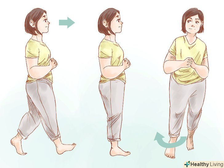 - Коли ви досягнете кінця вашого шляху, повністю зупиніться, поставивши ноги разом. Потім поверніться на правій нозі назад. Продовжуйте йти в зворотному напрямку повільними, зваженими рухами, як і в перший раз.