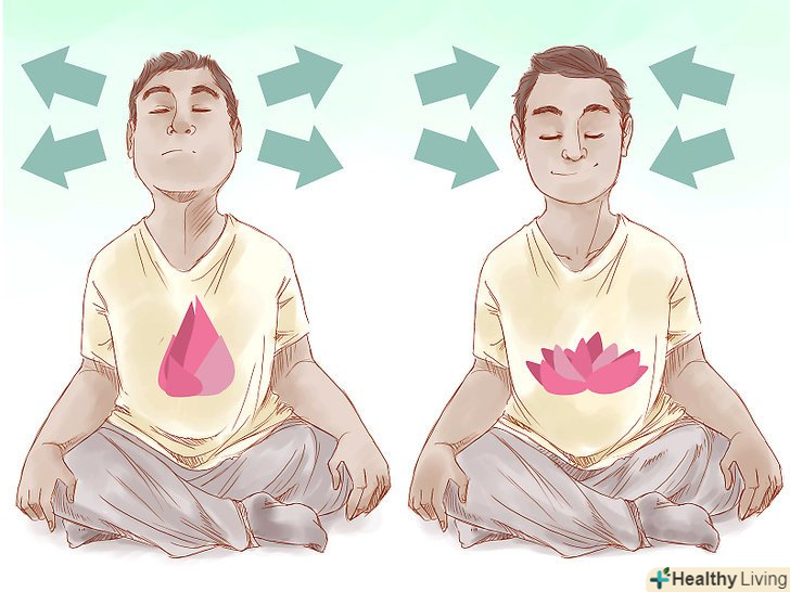 Сконцентруйтеся на диханні. сама основна і універсальна техніка медитації з усіх — дихальна медитація - відмінно підходить для початку. [15] виберіть точку над Вашим пупком і сконцентруйте свій розум на ній. Зверніть увагу на те, як опускається і піднімається ваша грудна клітка під час дихання. Не робіть усвідомлених зусиль, щоб змінити темп дихання, просто дихайте вільно.- Постарайтеся сфокусуватися на диханні і тільки на ньому. Не думайте про своє дихання і не давайте йому ніякої оцінки (наприклад, що останній вдих був коротше попереднього і так далі), просто постарайтеся усвідомлювати дихання. [12]