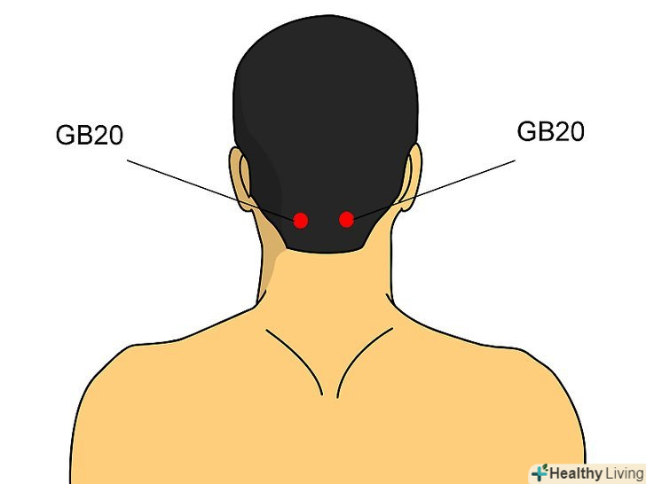 Спробуйте 20-ту точку меридіана жовчного міхура. GB 20-це 20-а точка меридіана жовчного міхура, також відома як фен-чи. Вона рекомендована при головних болях, мігрені, розпливчастому зорі або втоми, нестачі енергії, а також при симптомах застуди або грипу. GB 20 розташована в області шиї. [23]- Стисніть долоні, а потім розведіть їх, залишивши пальці переплетеними. Стисніть долоні в форму чаші. Ви будете натискати на акупресурні точки великими пальцями.