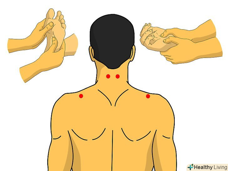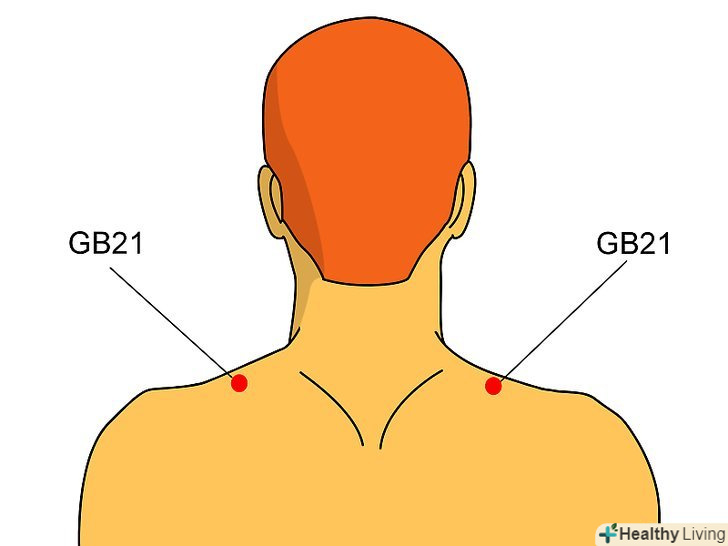 Спробуйте 21-ту точку меридіана жовчного міхура. GB 21-це 21-а точка меридіана жовчного міхура, також відома як Цзянь-цзин. Вона зазвичай використовується для зняття болю, ригідності потиличних м'язів, напруги в плечолопаткової області і головного болю. GB 21 розташована в плечі. [24]- Опустіть голову вниз. Спочатку знайдіть круглий виступ у верхній частині хребта, а потім акроміон плеча. GB 21 розташована по центру між цими двома місцями.