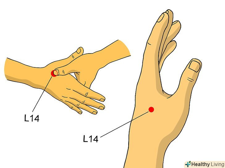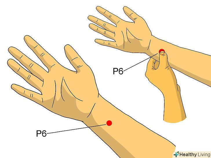 Спробуйте 6-ту точку меридіана перикарда. LV 6-це 6-а точка меридіана перикарда, також відома як ней-гуань. Вона рекомендується для зменшення нудоти, при розладі шлунка, заколисуванні, зап'ястному синдромі і головних болях. Вона розташована трохи вище зап'ястя. [28]- Виставте руку так, щоб долоню була звернена до вас, а пальці ‒ спрямовані до стелі. Прикладіть на зап'ясті перші 3 пальці іншої руки. Натисніть великим пальцем на зап'ясті приблизно під вказівним пальцем. Ви повинні відчути 2 великих сухожилля.