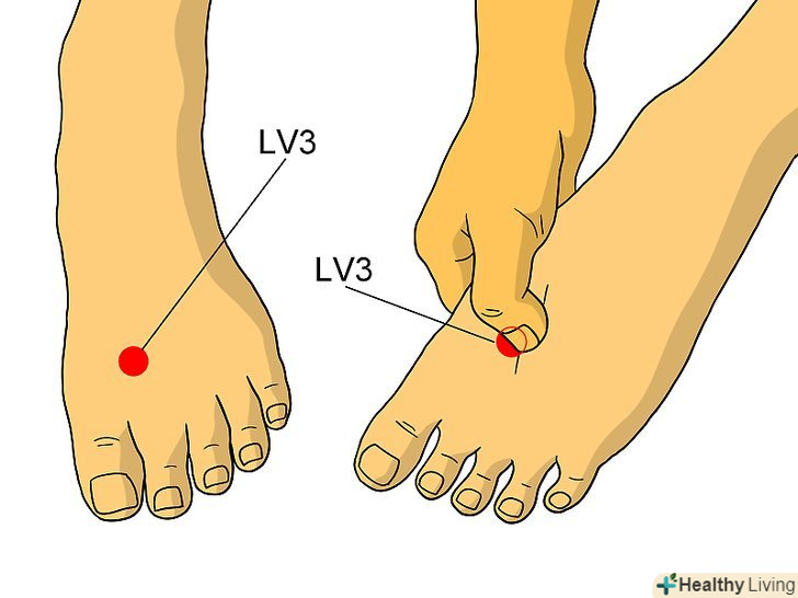 Спробуйте 3-Ю точку меридіана печінки. LV 3 ‒ це 3-а точка меридіана печінки, також відома як Тай-чун. Вона рекомендується при стресі, болі в попереку, високому кров'яному тиску, менструальних болях, болі в кінцівках, безсонні і почутті страху. [26] вона розташована в м'яких тканинах між великим і другим пальцями ніг. [27]- Ця точка знаходиться через два пальці від того місця, де з'єднується шкіра вашого великого і другого пальців ноги. Візьміть тупий предмет і натисніть на цю точку.