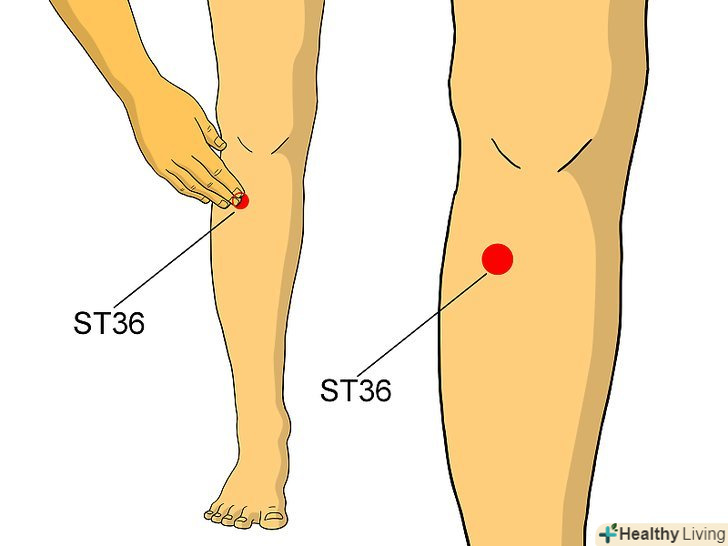 Спробуйте 36-ту точку меридіана шлунка. ST 36-це 36-а точка меридіана шлунка, також відома як Цзу-сань-Лі. Вона зазвичай використовується при розладі шлунково-кишкового тракту, нудоті, блювоті, стресі, для підняття імунної системи і зниження втоми. Вона розташована нижче колінної чашечки. [30]- Розмістіть 4 пальці на передній стороні ноги під колінної чашкою. Намацайте поглиблення між великогомілкової кісткою і м'язом ноги. Точка знаходиться за кісткою.