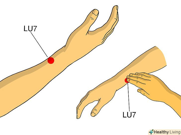 Спробуйте 7-у точку меридіана легенів. LU 7-це 7-а точка меридіана легенів, також відома як Лецюе. Вона використовується при болях в голові і шиї, болю в горлі, зубного болю, астмі, кашлі і для здорового імунітету. Вона розташована на руці. [32]- Підніміть великий палець вгору. Знайдіть поглиблення біля основи великого пальця, між сухожиллями. Точка акупресури знаходиться недалеко від цього місця, біля випирає кістки. [33]