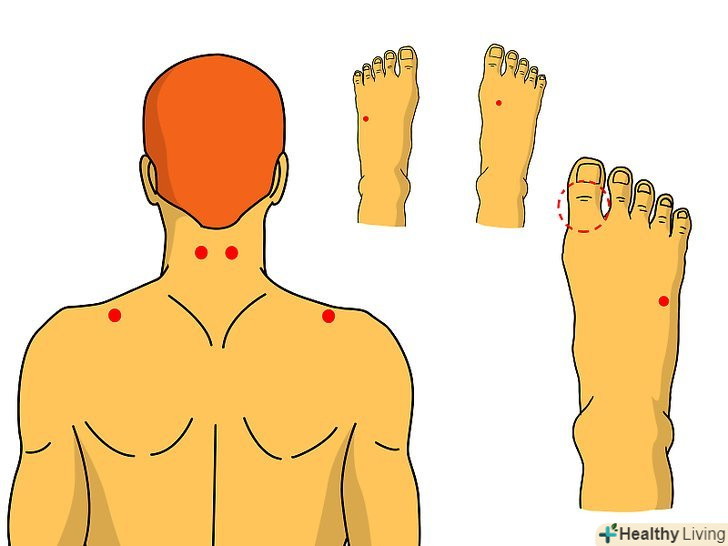 - Не використовуйте акупресурну точку, якщо вона знаходиться під родимкою, бородавкою, варикозною веною, садном, синцем, порізом або будь-яким іншим пошкодженням на шкірі. [34]