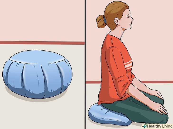 - Присядьте на дзафу. Розташуйте свої сідниці на верхній третині дзафу так, щоб вони були злегка підняті, а коліна спрямовані або впиралися в підлогу. Якщо потрібно, поставте подушку під коліна.