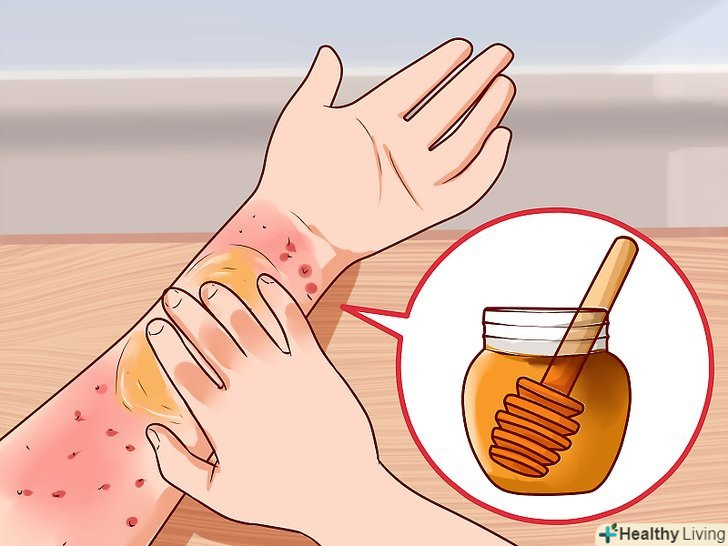 Полегшіть свербіж. алергічний висип, псоріаз або дерматит може призвести до корости або свербіння. [24] цей стан може викликати біль і подразнення шкіри, яке погіршується в нічний час доби. Нанесення меду на уражену ділянку шкіри допоможе зняти свербіж і запобігти зараженню інфекцією.- Нанесіть тонкий шар меду на сверблячу шкіру. Ви можете накрити її або залишити відкритою. Накрийте шкіру, якщо на вас є одяг або ви лежите в ліжку, щоб мед не прилипав до тканин.