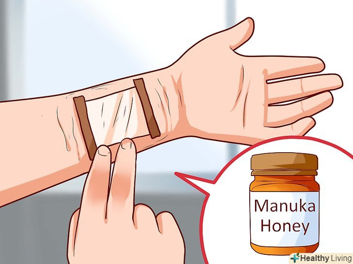 Нанесіть пов'язку з медом. коли рана буде чистою і сухою, ви зможете нанести мед. Нанесіть шар меду на бинт і обв'яжіть їм рану, щоб захистити її і вбити всі бактерії.- Обприскуйте медом одну сторону чистого бинта, марлі або клаптика тканини. Потім прикладіть сторону з медом на рану. [10] Мед повинен покривати не тільки саму рану, але і її околиці, щоб вбити бактерії в навколишніх тканинах. [11] Сильно не притискайте бинт до рани. Просто злегка прикладіть бинт, щоб мед опинився на шкірі.