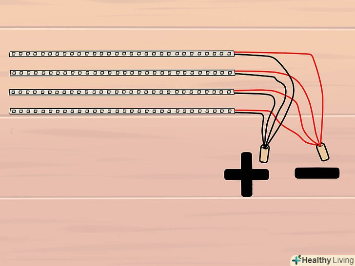 Підключіться до джерела живлення.з цього центрального вузла підключіть інший провід шляхом скручування одного боку до позитивної лінії і з іншого боку до негативного проводу. Оберніть ці з'єднання ізоляційною стрічкою. Тепер ви повинні мати один позитивний і негативний провід. Послабте Болти на позитивних і негативних клемах батареї. Покладіть позитивний дріт між позитивним клемою та головкою болта на цьому терміналі та затягніть дріт між болтом і терміналом. Повторіть цей крок з негативним проводом і негативним висновком.