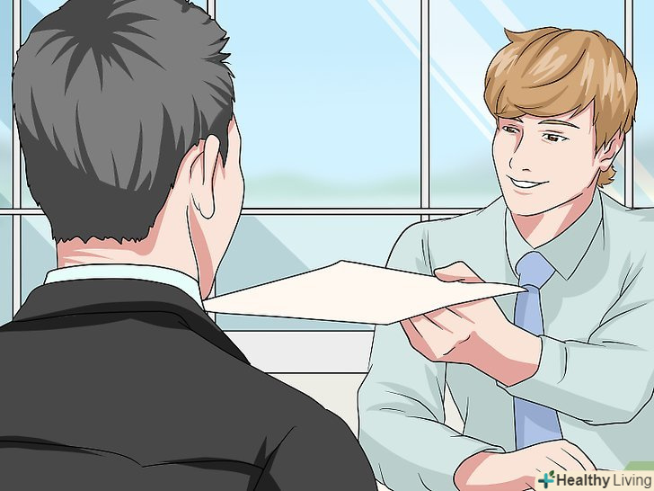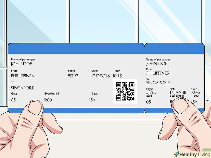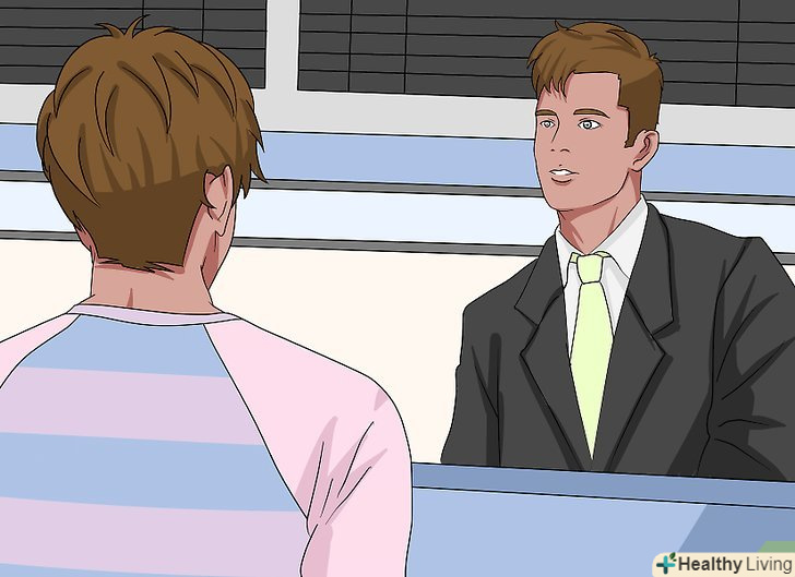 Пред'явіть співробітнику на стійці реєстрації документ, що засвідчує особу, та інформацію про ваш рейс.залежно від того, якою авіакомпанією і куди ви летите, співробітник може запитати номер вашого рейсу або номер бронювання, або ж для реєстрації буде достатньо тільки документа, що посвідчує особу. Тримайте документи і квитки в руках, щоб пред'явити їх на вимогу співробітника.[6]- Якщо ви бронювали квиток в Інтернеті, роздрукуйте підтвердження бронювання, щоб мати всю необхідну інформацію для пред'явлення співробітнику при реєстрації.