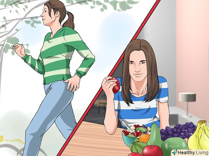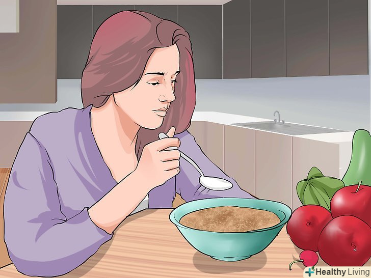 Дотримуйтесь збалансованої дієти з низьким вмістом натрію.щодня з'їдайте 2-3 порції фруктів і 3-5 порцій овочів. Вживайте багаті харчовими волокнами продукти, в тому числі хліб, каші, макарони і рис з цільного зерна, свіжі фрукти і овочі. Краще утримуватися від алкогольних напоїв або обмежити їх вживання однією порцією в день (одна порція відповідає 350 мілілітрів пива, 150 мілілітрів вина або 40 мілілітрів міцних напоїв).[10]- Уникайте висококалорійних і містять мало поживних речовин страв фастфуду та іншої шкідливої їжі. Крім великої кількості калорій і низької харчової цінності, подібна їжа часто містить багато натрію.