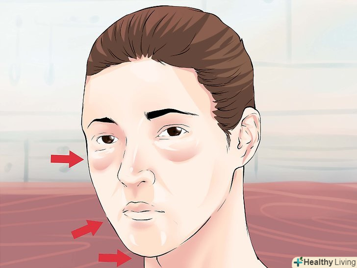 Зверніть увагу на набряк очей, обличчя, губ, шиї або області нижче підборіддя.симптоми лімфедеми голови і шиї зазвичай проявляються через 2-6 місяців після лікування раку в області голови. Іноді лімфедема розвивається в порожнині рота і глотці. Вона може також виникнути із зовнішнього боку на шиї та обличчі, або являти собою поєднання зовнішнього і внутрішнього набряку, в залежності від того, які лімфатичні канали перекриті.[20]- Зверніться до лікаря при будь-яких ознаках лімфедеми голови або шиї.
