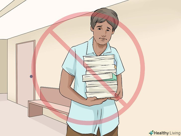 Не носіть тяжкості і наплічні сумки.у період відновлення після операції або терапії раку не носіть на хворій стороні тіла важкі предмети. Будьте обережні і не надто напружуйте руку, схильну до ризику розвитку лімфедеми.[4]- Якщо вам доводиться переносити що-небудь важке, тримайте руку вище пояса.