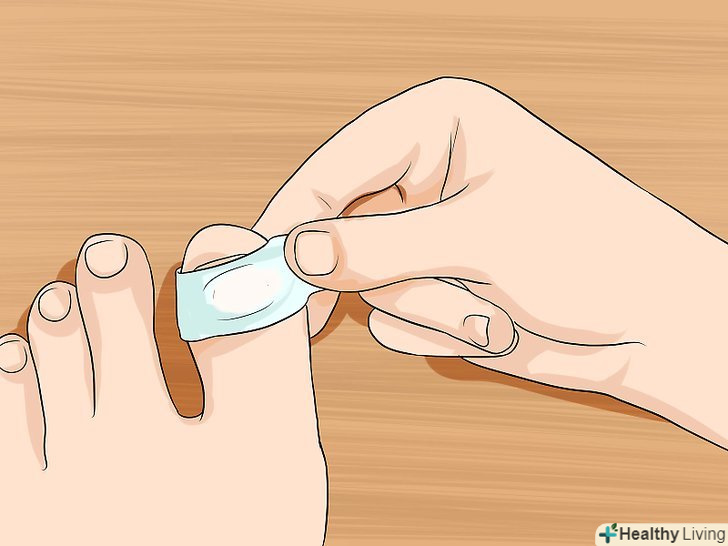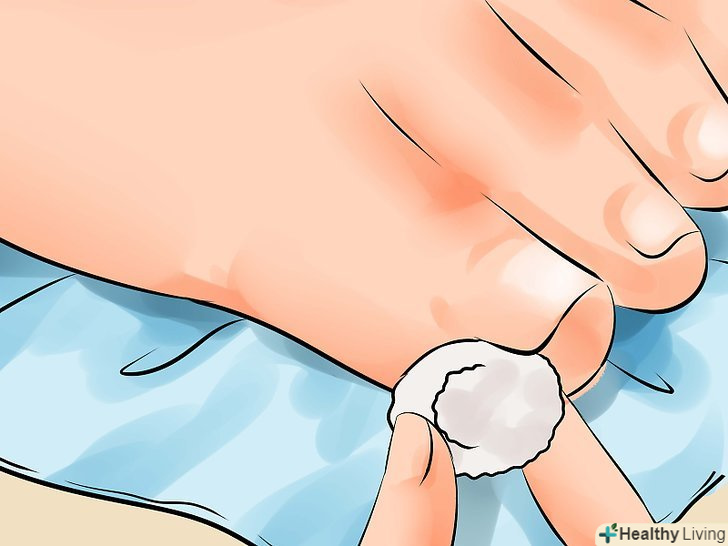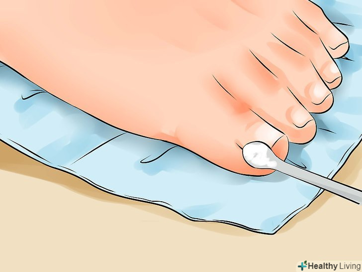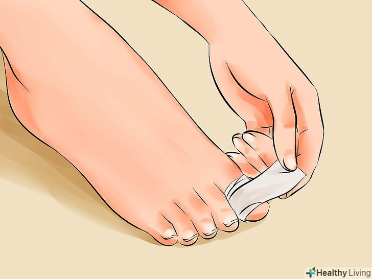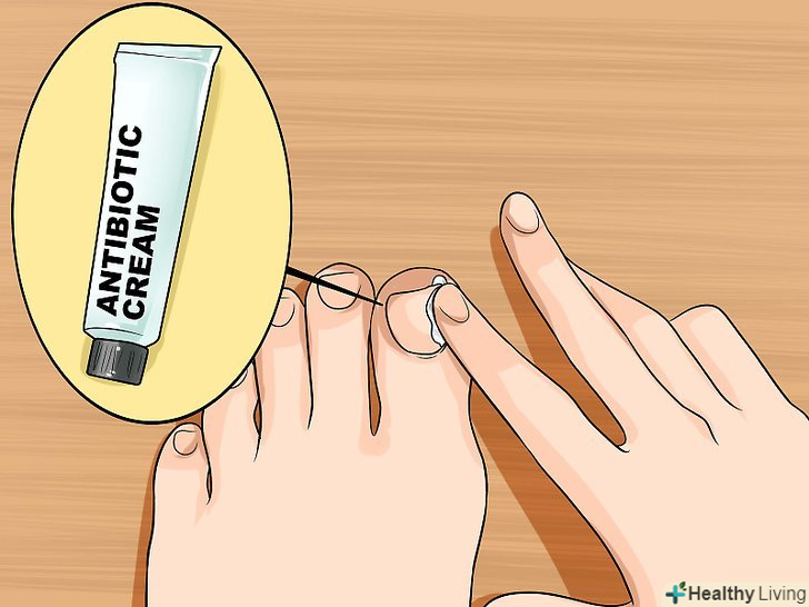 Потримайте ноги в теплій мильній воді 15-30 хвилин. Після цього ретельно їх промийте. Витріть ноги рушником. Нанесіть на уражену ділянку Неоспорин і забинтуйте палець, щоб уникнути інфекції.[15]
