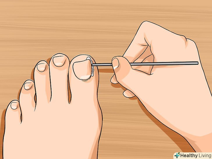 Трохи підніміть ніготь.використовуючи стерильний інструмент, злегка підніміть врослий ніготь і в простір між нігтьової пластиною і нігтьовим валиком підкладіть невеликий шматочок ватного тампона або зубну нитку. Так ніготь не буде впиватися в шкіру.[4]- Якщо ви використовуєте ватний тампон, відріжте від нього невеликий шматочок; якщо зубну нитку — знадобиться 15 см нитки.