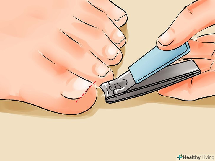 Слідкуйте за довжиною нігтів на ногах і обрізайте їх по рівній лінії.якщо закругляти нігті, ймовірність того, що нігтьова пластина вросте в бічний край нігтьового валика, збільшується.[10]- Користуйтеся щипчиками або ножицями для стрижки нігтів. Звичайні щипчики для нігтів досить маленькі, і вони залишають гострі кути по краях нігтів.