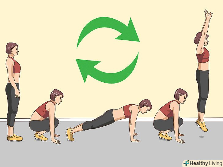 Займайтеся аеробікою. всі діти люблять займатися аеробікою в спортзалі, коли можна і пострибати, і порастягивать м'язи в формі гри. Одне з кращих вправ виконується так. Станьте прямо, стрибком опустіться в положення з упором на руки, виконайте віджимання від підлоги, і в стрибку поверніться в початкове положення. Повторюйте руху з максимально можливою швидкістю виконання, і ЧСС істотно збільшиться.