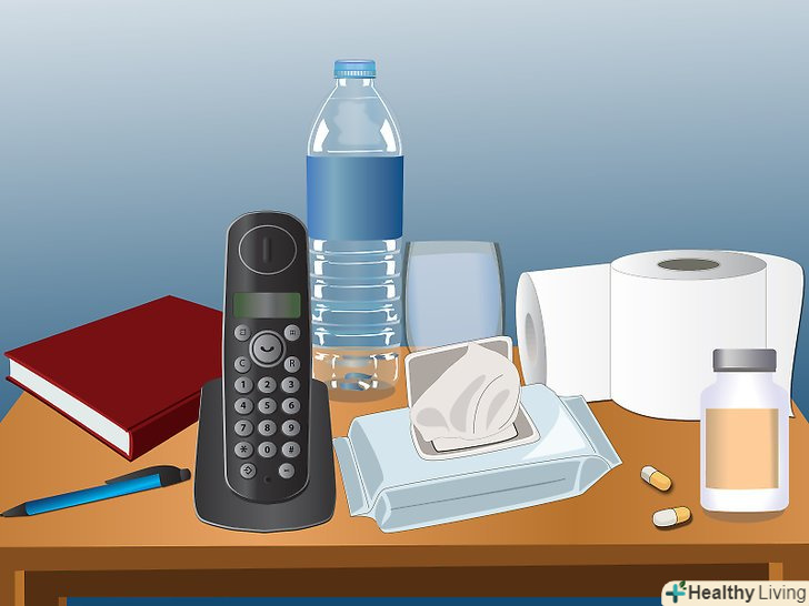 Покладіть біля ліжка основні речі, в яких потребуєте. по-перше, складіть список речей, які потрібні вам протягом дня: пляшка води, стакан і пакетик глюкози, ваші ліки, серветки, дезінфікуючий засіб для рук, паличка, щоб відкривати штори і т.п., ваш мобільний, щось почитати, ручка і папір-подумайте, що для вас важливіше і влаштуйте все відповідним чином. Кінцева мета полягає в економії енергії, а часті пересування за всіма цими речами дуже швидко виснажать вас.- Покладіть зумер біля ліжка.вам знадобиться людина, яка б подбала про вас на початковому етапі цієї хвороби, головним чином зайнявся вашим харчуванням і ліками. Ви будете витрачати багато сил, постійно кличучи когось вголос. Замість того, щоб використовувати зумер, ви можете залишати пропущені виклики.