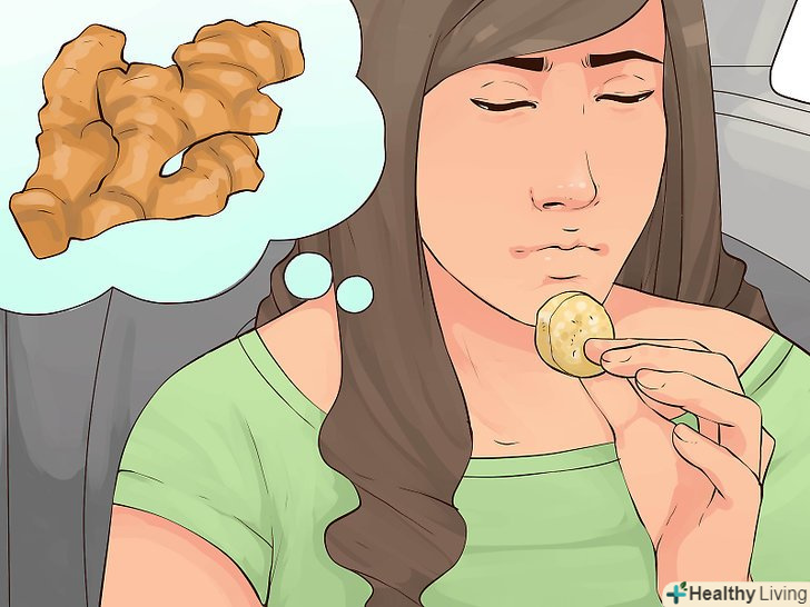Вживайте в їжу імбир. відомо, що імбир послаблює автомобільну хворобу та інші форми хвороби руху. [22] імбир можна їсти (або пити) різними способами. Існують імбирні льодяники, пастилки, чай , газована вода , таблетки, цукати і печиво. [23] подібні продукти допомагають заспокоїти шлунок. Головне переконатися, що продукт зроблений зі справжнього імбиру, а не містить штучну добавку.- Дізнайтеся у лікаря, чи можна вам приймати в їжу імбир. Іноді імбир може перешкоджати дії деяких препаратів. [24]