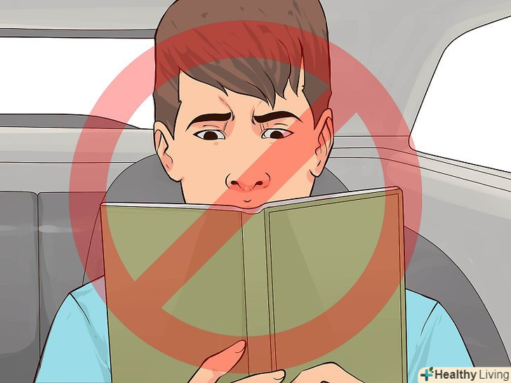 Не використовуйте книги, телефони та інші гаджети. Автомобільна хвороба лише погіршиться при концентрації на візуальному предметі всередині автомобіля, а не зовні. Пильний погляд на книгу , екран телефону, планшет або пристрій для читання може посилити невідповідність між сприйняттям очей і РЕШТИ організму. Вам потрібно дивитися тільки на предмети за межами автомобіля на лінії горизонту. [10]- Багатьох людей заколисує в автомобілі тільки під час читання. Уникайте таких ситуацій!