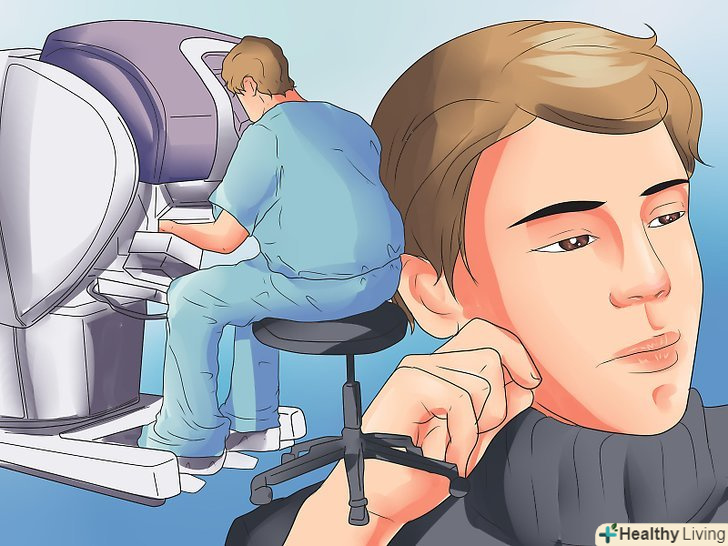 З'ясуйте, чи є ви кандидатом на роботизовану тимектомію.під час цієї процедури на грудній клітці пацієнта роблять надрізи і вводять через них роботизовані маніпулятори, які знаходяться на одній зі сторін базового блоку. Кілька медичних приладів кріпляться на іншій стороні, в тому числі ендоскопічні камери, за допомогою яких хірург бачить всередині тіла, а також гострі інструменти, якими хірург ріже і зашиває - тонкі і мініатюрні скальпелі і лазерні інструменти.- Оперуючий хірург використовує пристрій, за допомогою якого він управляє інструментами знаходяться всередині тіла пацієнта. Інструменти мають такі ж можливості, як і зап'ястя людини. Використовуючи інструменти і роблячи точні рухи, хірург ріже і зашиває.