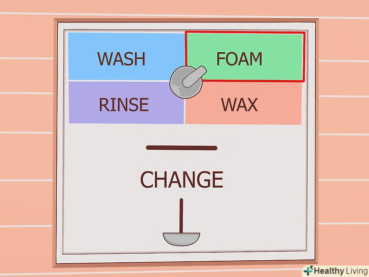 Переключіть стрілку на стадію основної мийки.зі шланга моментально почне надходити мильний розчин. На цьому етапі добре мати ганчірку, щоб витирати піну. Попросіть друга допомогти Вам у цьому. Якщо хочете, можете також промити піною Килимки для ніг.- Якщо вам потрібно більше одного повного циклу, нехай час закінчиться, коли ви перебуваєте на етапі Чищення піною, щоб після того, як припиниться подача піни, у вас було достатньо часу для роботи зі щіткою. У цей час ви також зможете помітити місця, які ви пропустили, які проявляться після розчинення піни, і вам не доведеться поспішати, так як час вже вийшло. Тільки не допускайте, щоб піна надовго залишалася на поверхні автомобіля, і не утворилася плівка. Під час роботи зі щіткою безперервно змочуйте поверхню автомобіля водою.