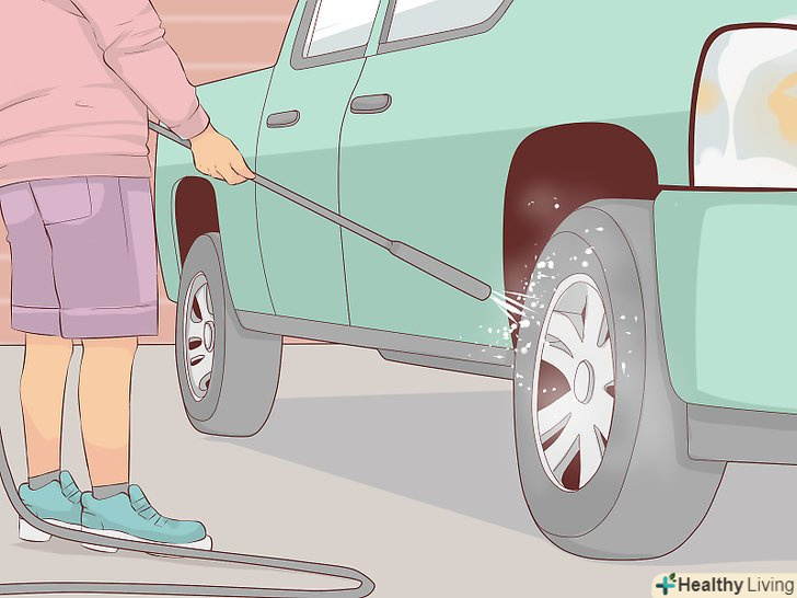 - Потужним напором води промийте колісні ніші і низ автомобіля. У більшості автомобілів можна промити і двигун, але не потужним напором води.