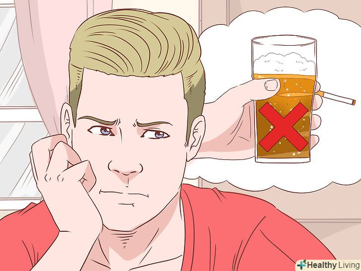 Відстежуйте розвиток синдрому відміни.синдром відміни тютюну може супроводжуватися неприємними фізично і емоційно симптомами, а синдроми відміни алкоголю можуть бути і зовсім небезпечні. Тяжкість синдрому відміни алкоголю може бути різною, все залежить від того, скільки і як довго ви пили, а також від вашого стану здоров'я.[23] деякі симптоми можуть з'явитися вже через кілька годин, досягти піку через кілька днів, але вже через тиждень стан хворих, як правило, поліпшується.[24]- Синдром відміни алкоголю може призводити до симптомів, що викликають важкі психічні та неврологічні розлади, включаючи тремор, збудження, занепокоєння, страх, галюцинації та судоми.[25] якщо у вас виник один з цих симптомів, зверніться до лікаря якомога швидше.