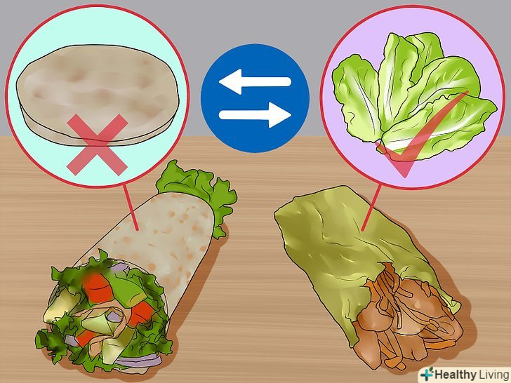 Підберіть замінники поширених продуктів, що містять глютен.якщо ви хочете уникнути безглютенових продуктів, які пройшли високий ступінь обробки, але у вас немає бажання самостійно випікати їх замінники, існує парочка корисних хитрощів.- Замініть Хлібний лаваш стравами в листі салату. Природно, листя салату не містять глютену, також в них мало калорій і вони стануть відмінною основою для подачі м'яса, салату з тунця, хумуса або овочів.