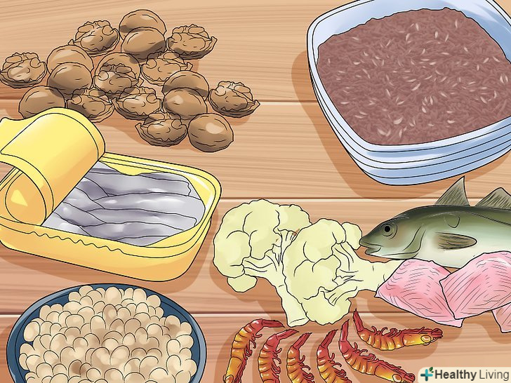 Вживайте їжу, багату омега-3 ненасиченими жирними кислотами, які допомагають зняти запалення носових пазух.омега-3 жирні кислоти мають протизапальні властивості, що дозволяють знизити викликане алергією запалення пазух носа. Крім того, ці кислоти зміцнюють легені та імунну систему, допомагаючи організму боротися з пилковою алергією.[10]- Омега - 3 жирними кислотами багаті такі продукти, як насіння льону, волоські горіхи, соєві боби, цвітна капуста, сардини, лосось і креветки.