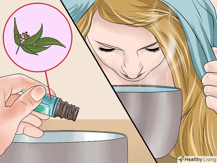 Використовуйте евкаліпт як протинабряковий засіб.евкаліпт входить до складу багатьох таблеток і сиропів від кашлю. Лікувальна дія евкаліпта пояснюється тим, що в ньому присутня речовина цинеол. Ця речовина має безліч корисних властивостей: воно полегшує відхаркування і кашель, знімає закладеність носа і роздратування носових проходів.[28]- Евкаліптова ефірна олія має протизапальні, противірусні та антибактеріальні властивості. Вдихання парів евкаліптової олії допомагає зняти закладеність носа, тому дане масло можна використовувати для лікування синуситу.
